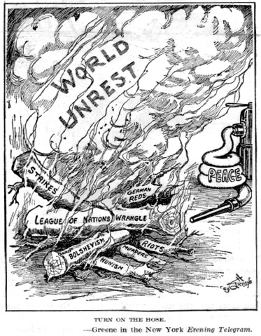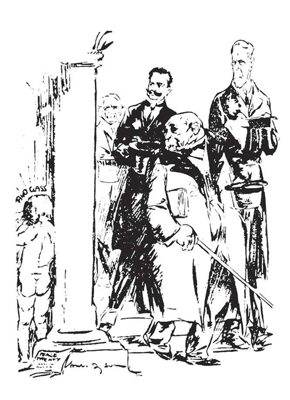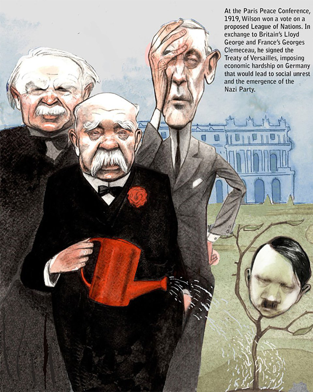 Карикатура на Версальский договор. Ллойд Джордж, Клемансо и Вильсон наказывают Германию (в роли ребенка), несогласную с условиями наказания